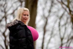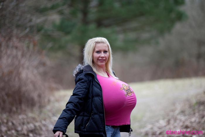 New update in Diary section with unbeleivable massive titted Beshine. The photo set consists of 56 photographs, which are taken while Beshine was walking around in the park in hood-jacket and pink T-shirt, without bra under it – she has just set free her oversized silicone bust.