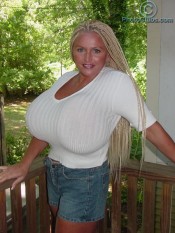 Blonde minion BB Gunns is in the last photo set for her fans. Blue-eyed silicone super star poses on the porch in white t-shirt and short denim trousers. What else to say about the blonde mane, plaited in numerous small braids, except: ‘beauty requires sacrifice’! And only busty BB Gunns knows what it takes to maintain such hair.