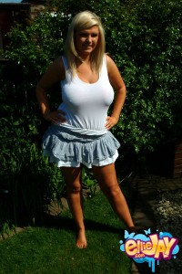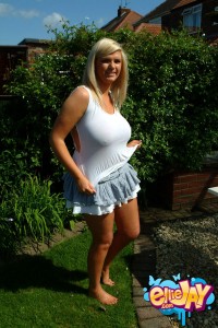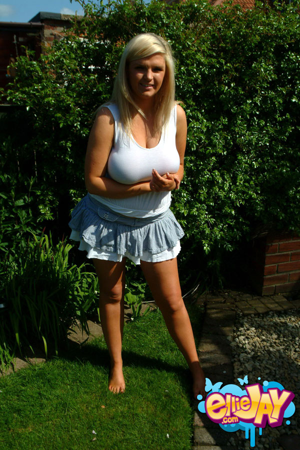 Big titted blonde Ellie Jay posing in white top outdoor.