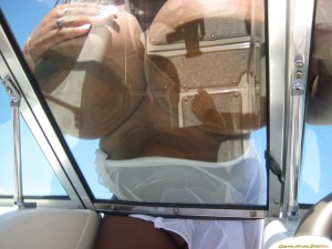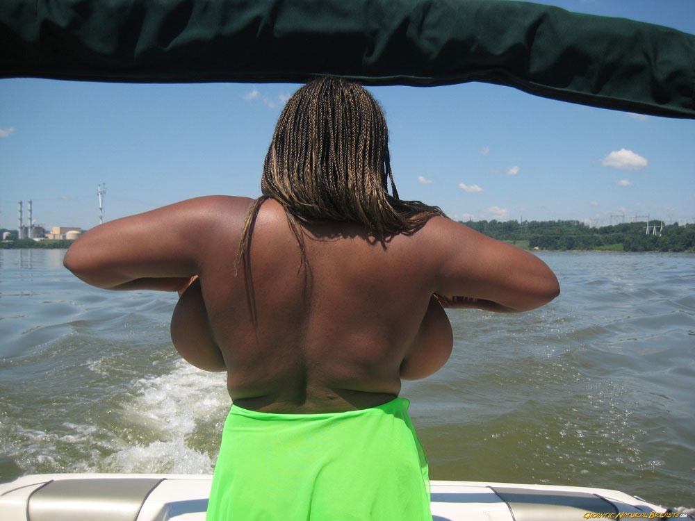 Pretty huge natural boobed ebony babe Mianna Thomas posing on boat deck.