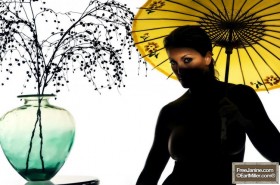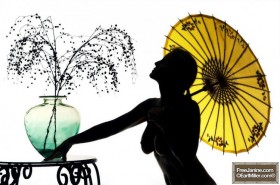 This is second part of ‘White Shirt’ photo set with Janine Lindemulder on her official page. Remained only in black barrette and tattoos, charming and sex appealing Janine poses ably behind the grids of baldachin bed.
