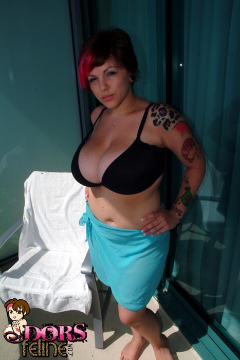 Sexy brunette babe Dors Feline with her big natural 34FF boobs stripping off her black bikini.
