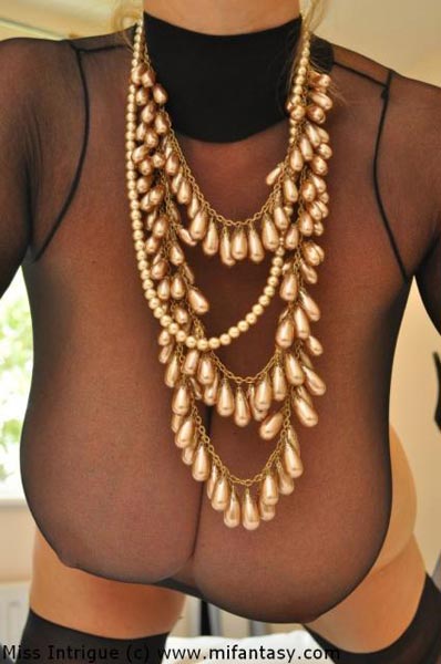 Great jewelry of very beautiful pearls, black super sheer tulle body and black tights – this is what 30J Miss Intrigue has put on in her latest update “Sheer Black Top“. That must be the outfit of every woman who wants to attract the attention of her husband after a long work day, and if also having enormous big natural boobs like those of Miss Intrigue, 100% will attract all the male attention, unless it is Sir Elton John. 😉