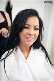So much charming after makeup for the video, that in the photo set behind the scenes Rachel Aldana looks like a living Barbie doll, very sexy in that short green dress. From the first photo, or it might be the angle of shooting, Rachel Aldana looks finer than ever. She may have lost some weight, but her big natural tits are still that magnetic!