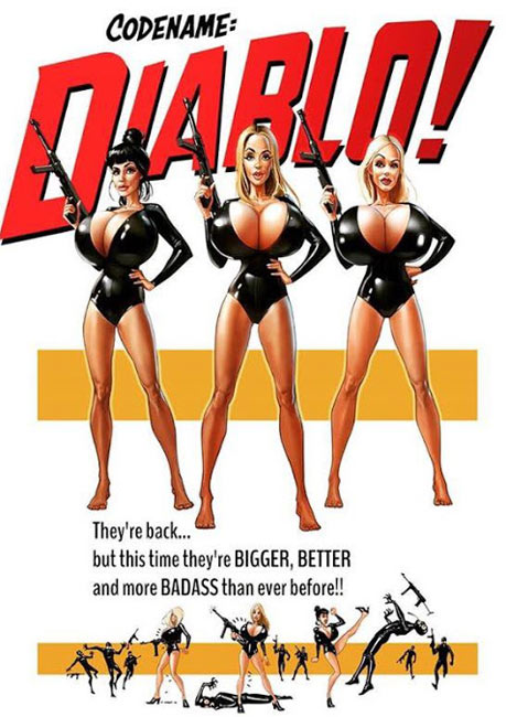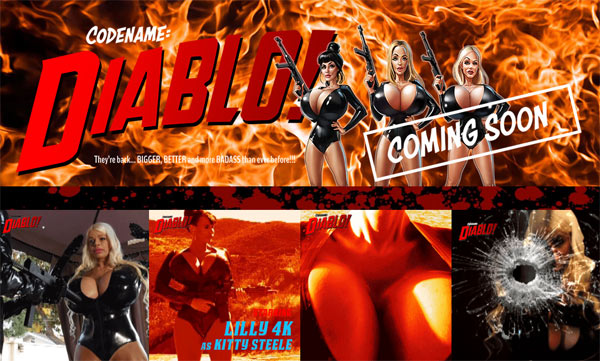 3 years ago Blonde Squad came out featuring Elizabeth Starr, Lacey Wildd and Summer Cummings . Now’s the turn of another movie titled CodeNameDiablo, the theme is the same with accents to Russ Meyeresque & Benny Hill: the good guys (who are high-heeled, dressed in latex or in bathing suits with huge breasts) beat the bad guys wherever they meet them. 😉 Release date not yet announced.